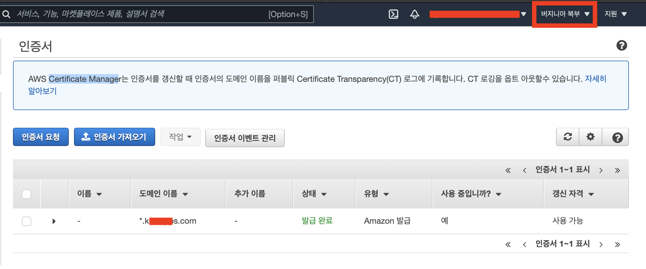 참고로 해당 SSL을 보이게 하기 위해선 Certificate Manager 가 버저니아 북부 리전에 등록되어 있어야 한다.