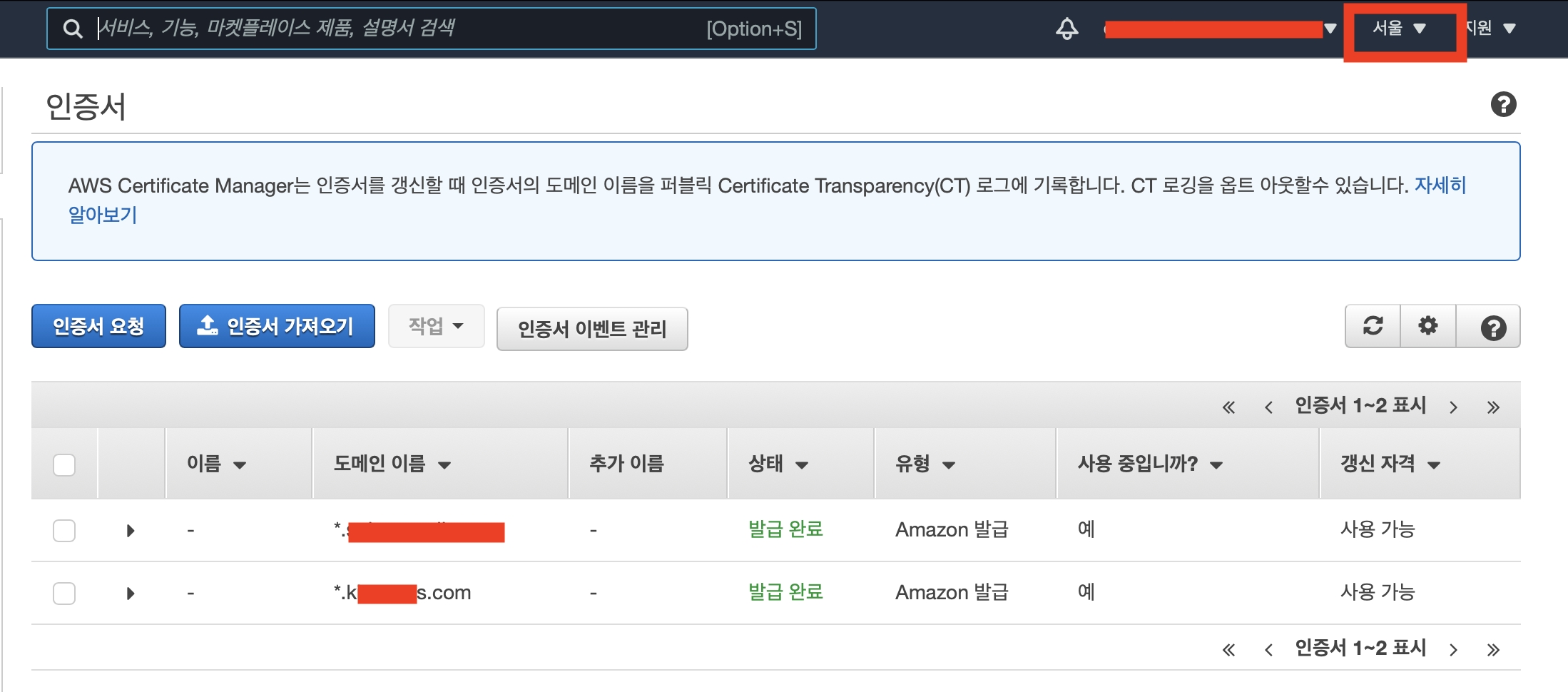 서울 리전 (버지니아 북부 리전과 같은 도메인이 등록되어 있다)