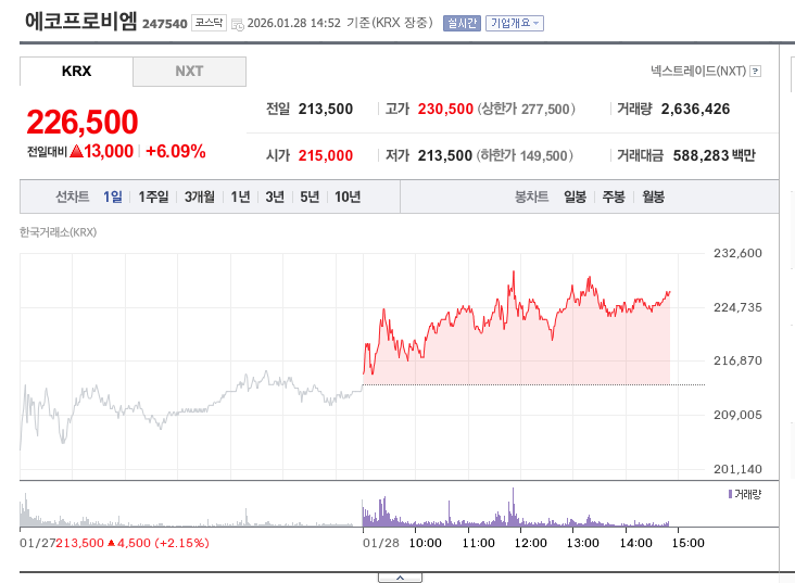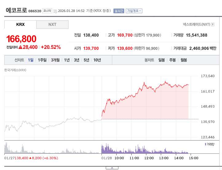 1월 28일 장중 16만 9,700원 돌파하며 52주 신고가를 새로 쓰고, 에코프로비엠을 제치고 코스닥 시총 2위에 올랐습니다.