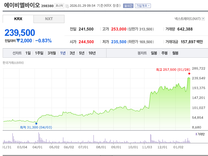 NH투자증권은 에이비엘바이오를 "알테오젠 이후 다음 바이오텍 주도주"로 평가했습니다. 다올투자증권은 목표주가 26만원, 핵심 플랫폼 가치를 최대 10.5조원으로 재평가했습니다.