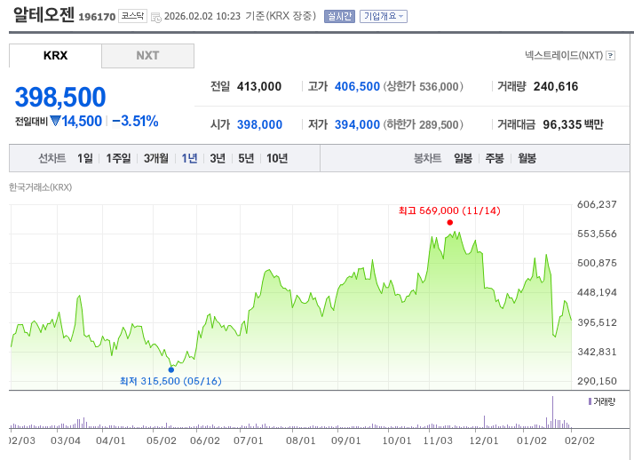 1월 21일 '알테오젠 쇼크'로 22% 폭락한 이후 40만원대 초반에서 등락을 반복하고 있습니다. 주요 투자 지표는 다음과 같습니다.