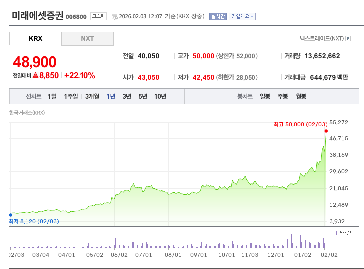 - 미래에셋증권: 전일 대비 12.23% 상승 (4만4,950원)