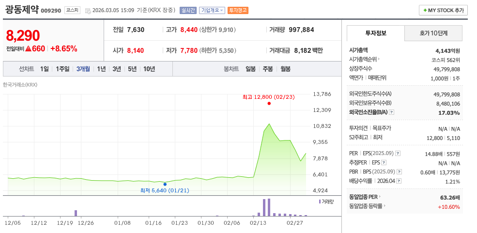 - 리스크: 인공눈물 매출이 전사에서 차지하는 비중은 작음. 광동제약은 비타500, 경옥고 등 음료·한방 매출이 주력. 인공눈물 단독 테마로 주가 반응은 제한적
