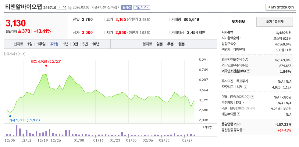 - 리스크: 2025년 283억 원 유상증자 단행. R&D 비용 부담으로 적자 지속 중. FDA 허가 시점 불확실. 시가총액 소형으로 변동성 극심