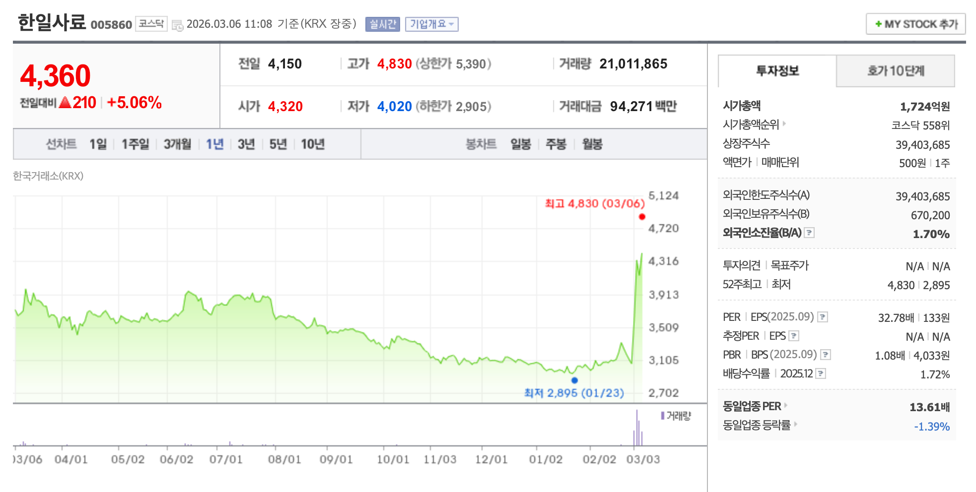 💡 한일사료 (005860, 코스피)