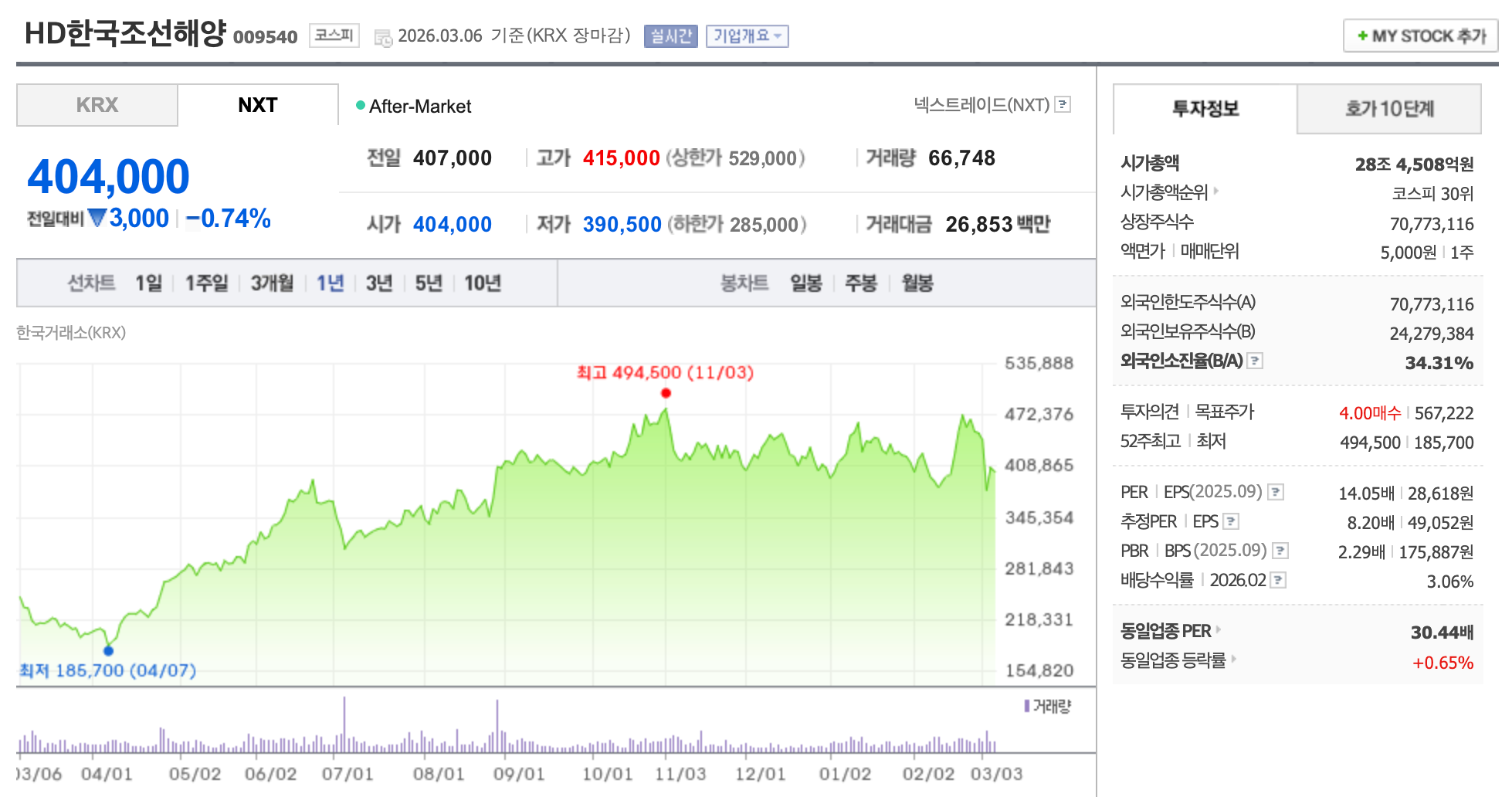 📌 HD한국조선해양 (009540, 코스피) / 한화오션 (042660, 코스피) / 삼성중공업 (010140, 코스피)