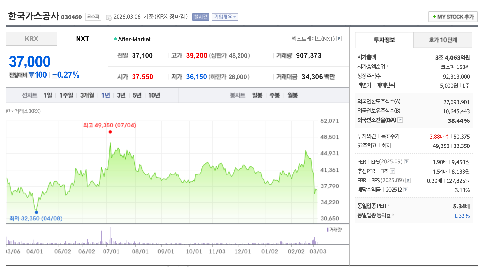 📌 한국가스공사 (036460, 코스피) - 대장주