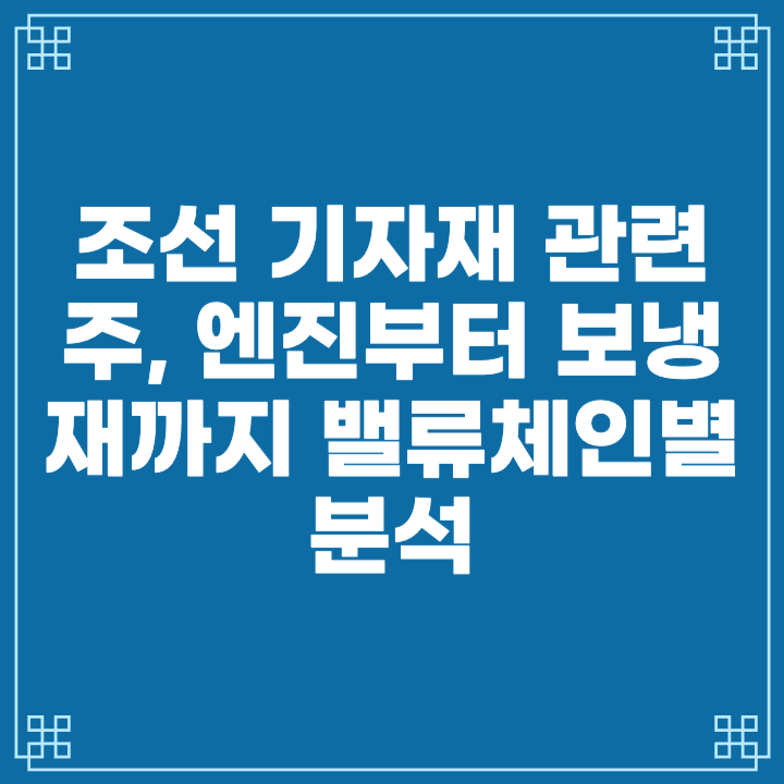 조선 기자재는 크게 엔진 → 보냉재/화물창 → 배관·피팅 → 선박 블록·의장 → 갑판기계로 나뉩니다.