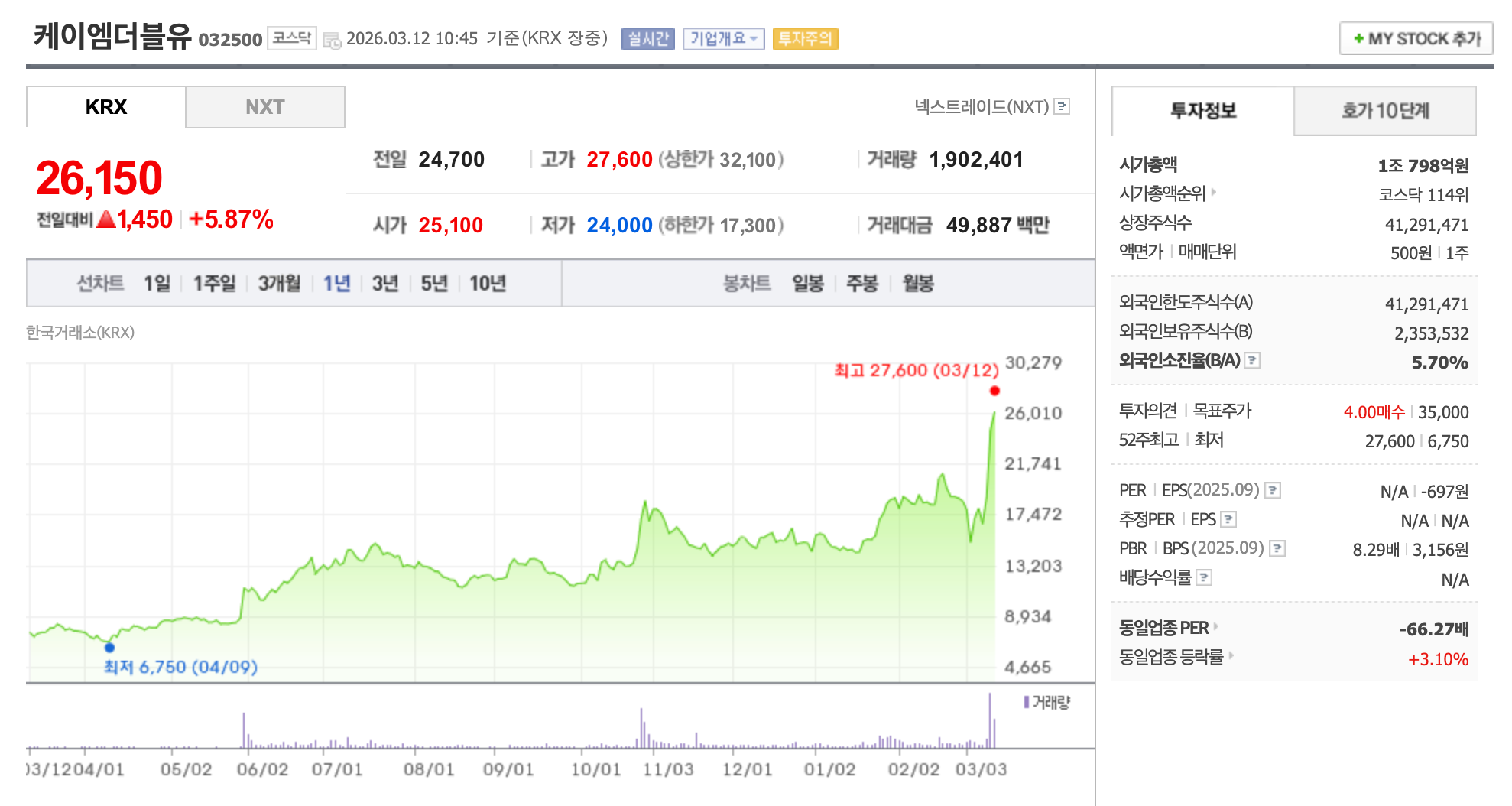 - 리스크: 소형주. 테마 급등 후 되돌림 위험. 현재 주가 수백 원대로 동전주 성격