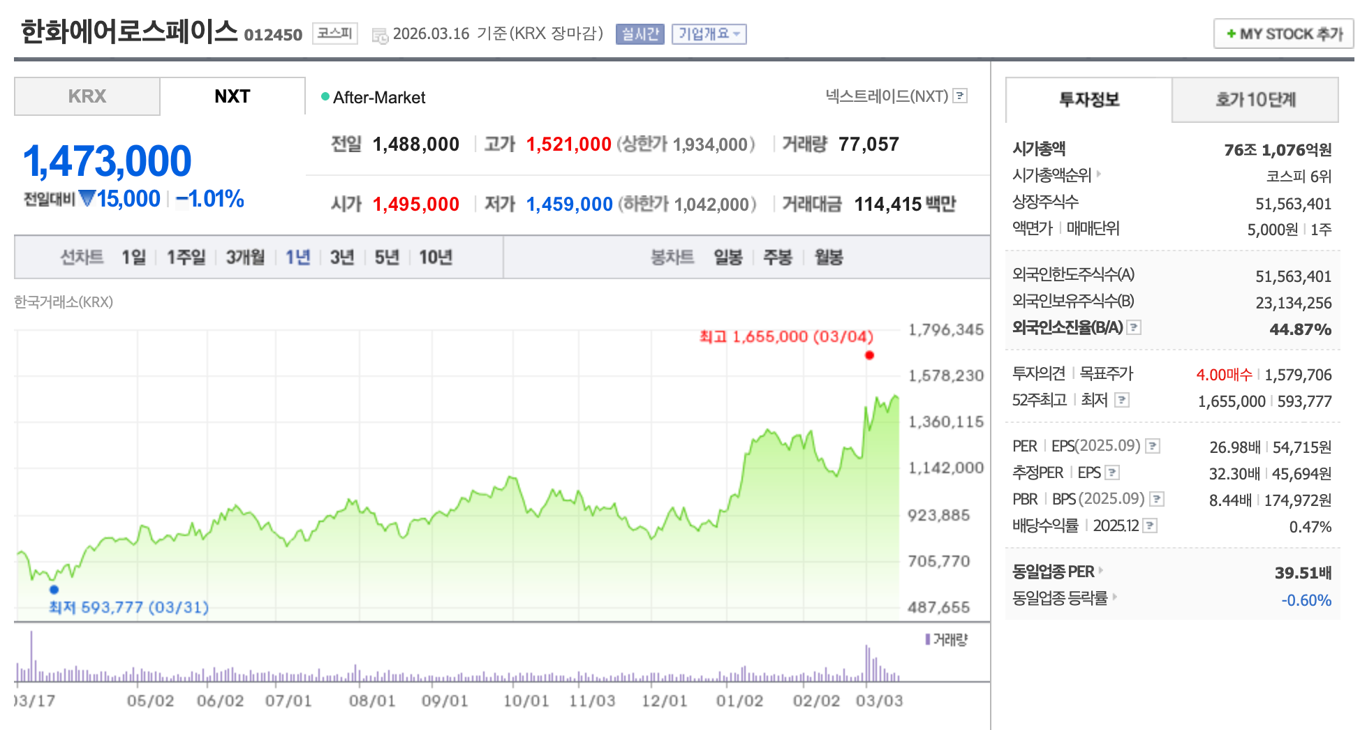 - 리스크: 단기 급등(+27.7%) 이후 밸류에이션 부담. 한화그룹과 천궁-III 체계종합 수주전 경쟁 돌입. 중동 전쟁 종료 시 테마 프리미엄 축소 가능