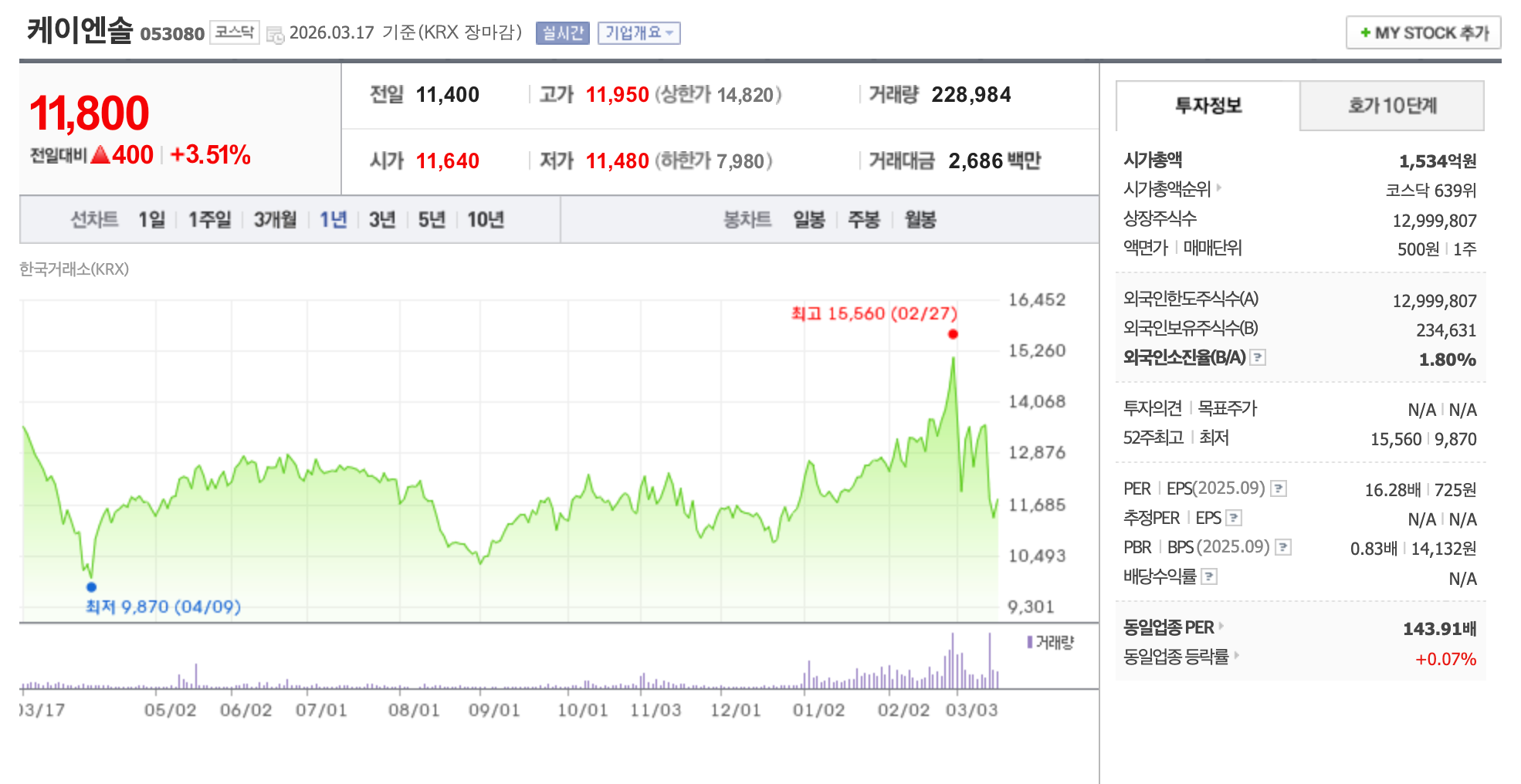 - 리스크: 액침냉각 상용화 시점이 아직 불확실. 현재 매출의 대부분은 클린룸·교량 사업. 소형주 테마 급등·급락 반복