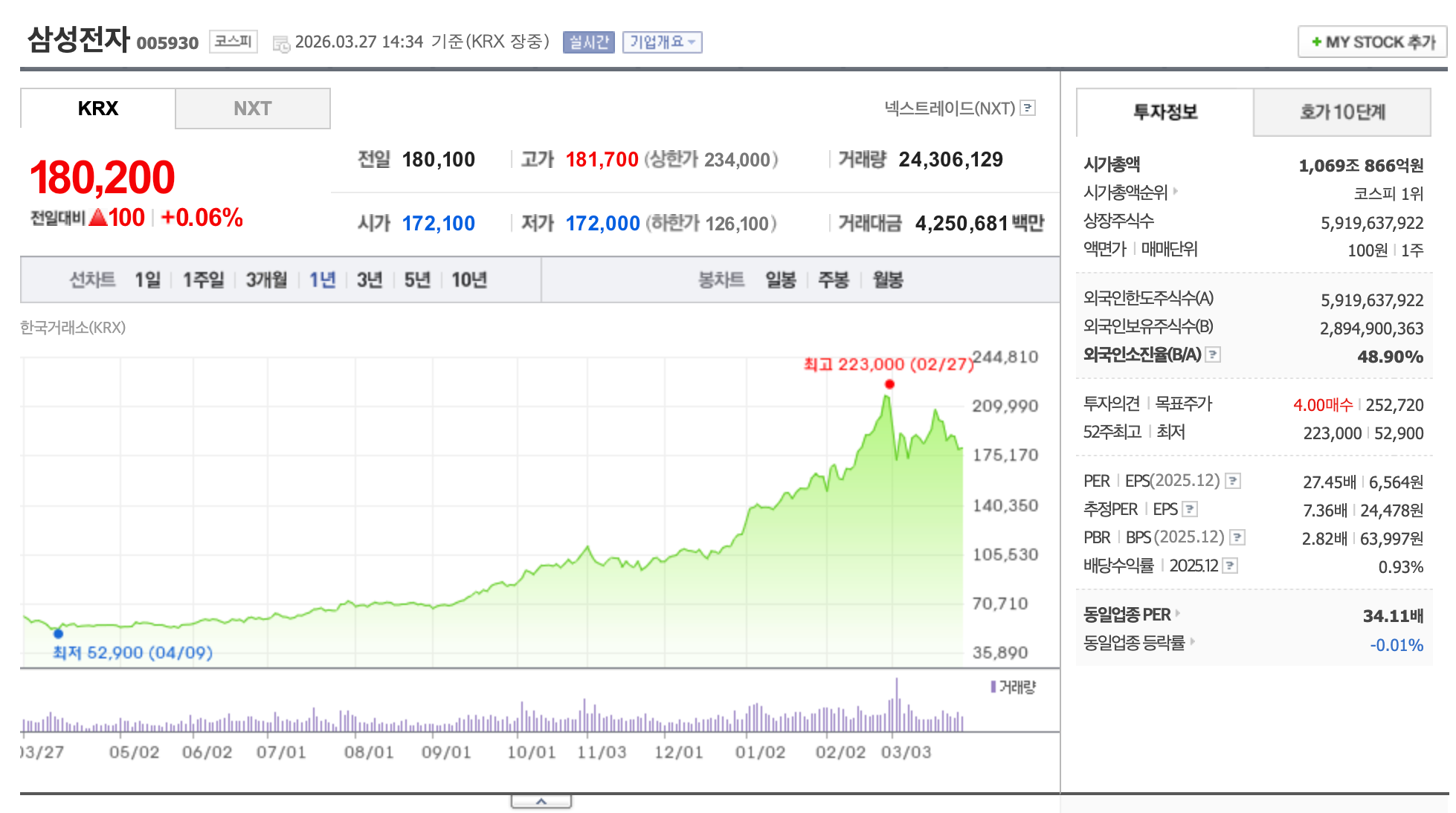 ⚠️ 우선주는 보통주 대비 거래량이 적습니다. 대량 매매 시 원하는 가격에 체결되지 않을 수 있고, 급락장에서 매도가 어려울 수 있습니다. 다만 삼성전자 우선주는 시가총액만 수십조 원 규모여서 일반 개인 투자자 수준에서는 유동성 문제가 크지 않습니다.
