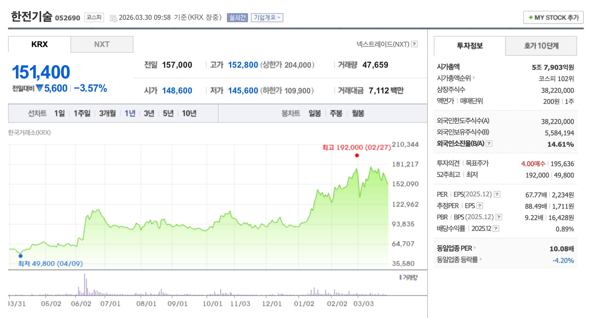 - 리스크: 단기 테마성 급등 후 급락 패턴 반복. 3월 3일 급등 후 10일 14.87% 폭락 사례