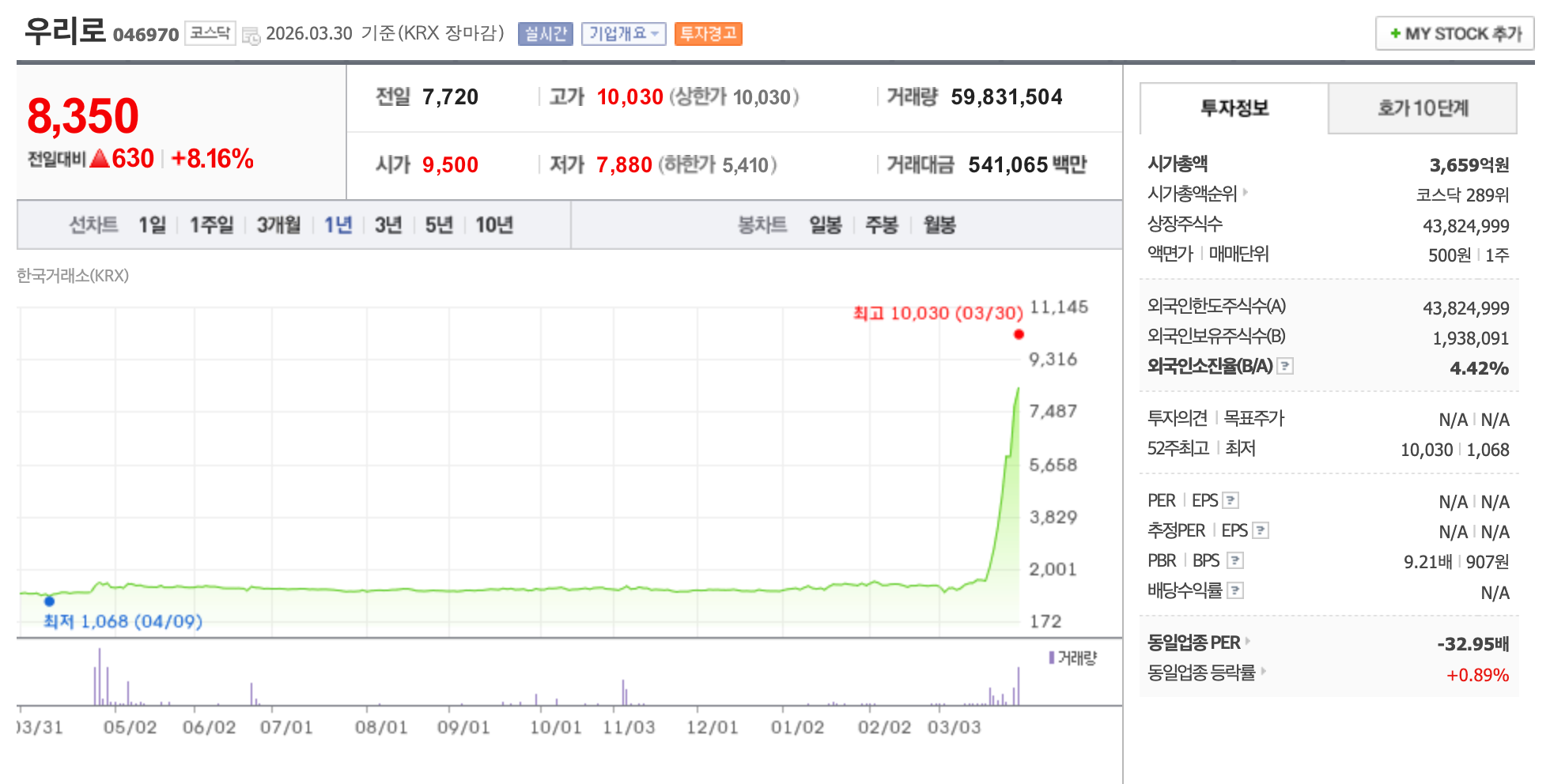 - 최근 주가: 3월 19~27일 6거래일 연속 상한가, 380% 급등 (투자경고종목 지정)