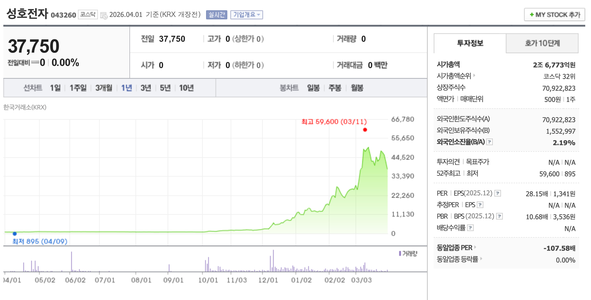 - 리스크: 모회사 성호전자 본업(전원공급장치·필름콘덴서)과 괴리. 자회사 실적이 연결 재무제표에 미치는 영향 확인 필요